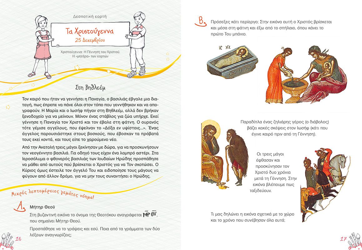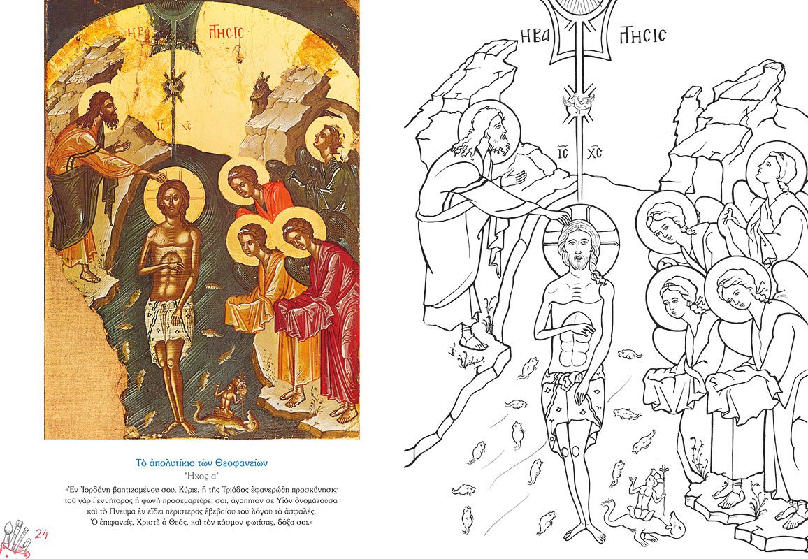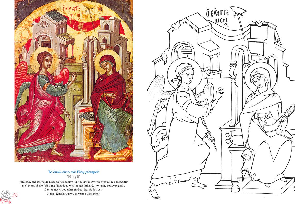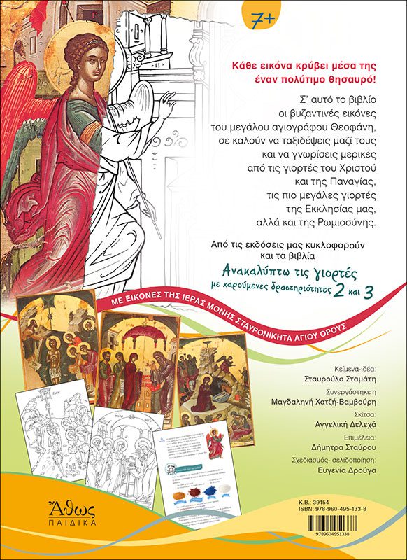 Ένα πρωτότυπο αυτό βιβλίο δραστηριοτήτων αφιερωμένο στις Δεσποτικές και Θεομητορικές γιορτές της Εκκλησία μας. Στο πρώτο τεύχος της σειράς περιλαμβάνονται εικόνες από τον Ευαγγελισμό μέχρι και τη ΒάπΤΙΣη του Χριστού. Σε κάθε εορτή ανΤΙΣτοιχεί μία έγχρωμη εικόνα από το περίφημο δωδεκάορτο του μεγάλου αγιογράφου Θεοφάνη του Κρητός που βρίσκονται στην Ιερά Μονή Σταυρονικήτα, αλλά και της σύγχρονης αγιογράφου Χριστίνας Δουληγέρη Παπαθέου. Το εικαστικό υλικό συμπληρώνουν σύντομα και απλά κείμενα που εξιστορούν στα παιδιά τα ανΤΙΣτοιχα γεγονότα όπως περιγράφονται στην Καινή Διαθήκη. Τέλος έξυπνες δραστηριότητες και χρωμοσελίδες θα τα ψυχαγωγήσουν και θα τα εισάγουν στον υπέροχο κόσμο της βυζαντινής εικονογραφίας.