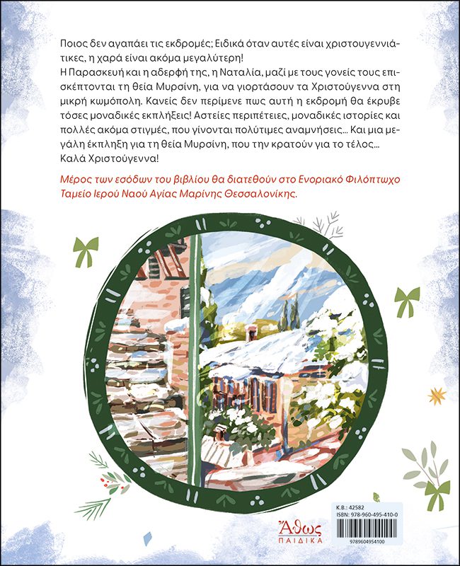 Μια οικογενειακή εκδρομή στο σπίτι της θείας Μυρσίνης κρύβει όμορφες εκπλήξεις και πολύτιμες στιγμές! Αστείες περιπέτειες, γιορτινές λιχουδιές, ιστορίες και όμορφες συναντήσεις, θα κάνουν αυτή τη χριστουγεννιάτικη εκδρομή αξέχαστη! Μια ιστορία, που μοσχομυρίζει χριστουγεννιάτικη θαλπωρή, από την πένα του π. Αθανασίου Καρανταϊδη με την εικονογράφηση της Αγγελικής Δελεχά! Προλογίζει ο Μητροπολίτης Θεσσαλονίκης κ. Φιλόθεος.