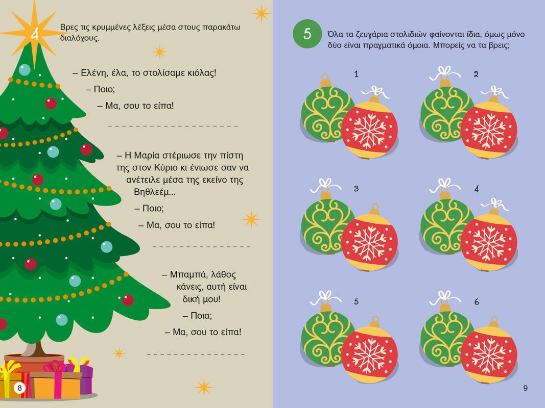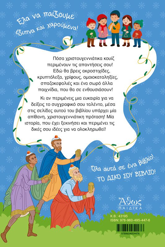 Το πιο πρωτότυπο βιβλίο χριστουγεννιάτικων δραστηριοτήτων, βασισμένο στα ελληνικά χριστουγεννιάτικα ήθη και έθιμα: Κουίζ, λαβύρινθοι, προβλήματα λογικής, σταυρόλεξα, δημιουργική γραφή και πολλά ακόμα! Από την βραβευμένη συγγραφέα Κατερίνα Μουρίκη με την καλλιτεχνική επιμέλεια της Ευγενίας Δρούγα.