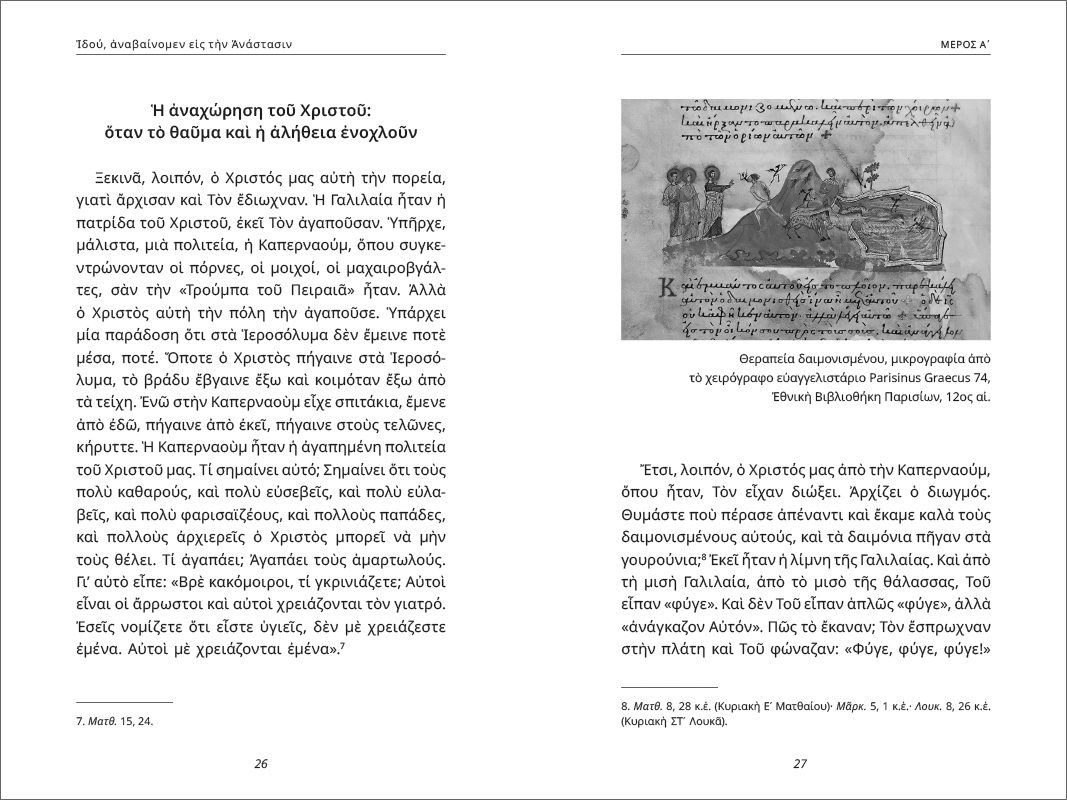 | ΕΙΣΑΓΩΓΙΚΟ ΣΗΜΕΙΩΜΑ Σεβασμιωτάτου Μητροπολίτου Καμερούν, Γρηγορίου 11 Mέρος A΄ «Ιδού, αναβαίνομεν…» 17 Mέρος Β΄ Τρεις τάξεις Ισραηλιτών συμμαχούν εναντίον του Χριστού 125 Η κατά Χριστόν γνώση και αναγνώριση εξουσιών και υποχρεώσεων 133 Mέρος Γ΄ Το Ευαγγέλιο ως ψυχική μα και φυσική προστασία 281 ΠΑΡΑΡΤΗΜΑ ΕΙΚΟΝΩΝ 409 |