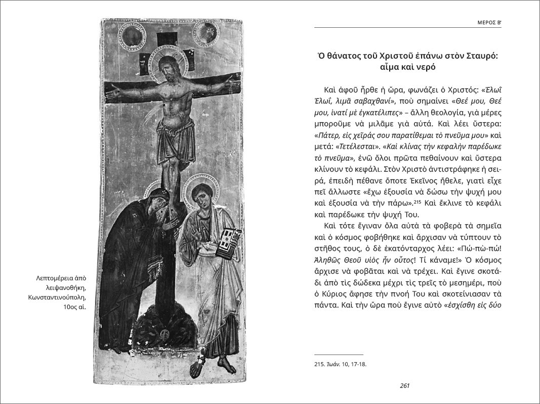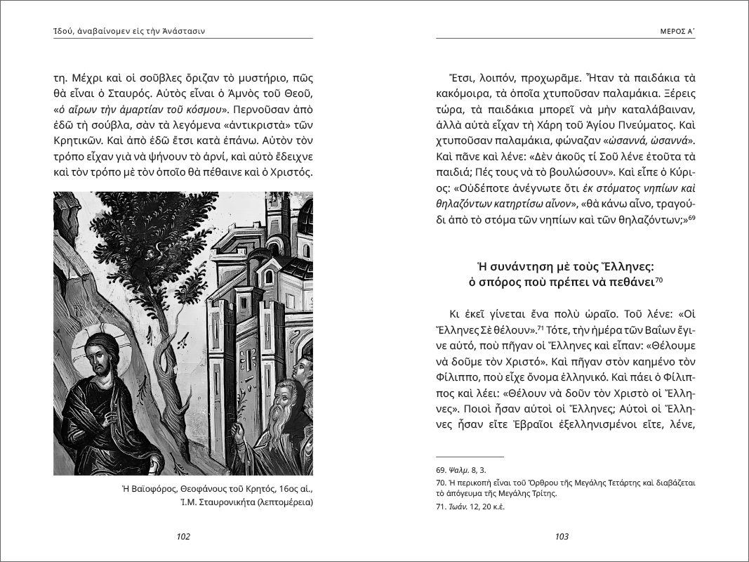 Από τον πατέρα Ευάγγελο Παπανικολάου, ιερέα και ιατρό, έχουμε στα χέρια μας μία αναλυτική προσέγγιση της Αγίας και Μεγάλης Εβδομάδας, από το Σάββατο του Λαζάρου μέχρι την Ανάσταση. Ο πατήρ αναλύει διεξοδικά, παραθέτοντας κείμενα πατερικά, υμνολογικά και αγιολογικά, αλλά και παρατηρώντας με σύγχρονη ματιά, κάθε λεπτομέρεια του ιστορικού των Παθών και της Ανάστασης του Κυρίου, όπως έγιναν ιστορικά και όπως τα ζούμε μέχρι σήμερα στην Εκκλησία. Η έκδοση περιλαμβάνει πλούσια εικονογράφηση με έγχωμο ένθετο, προσφέροντάς μας μία ανθολόγηση σύνολης της χριστιανικής βυζαντινής εικονογραφίας.