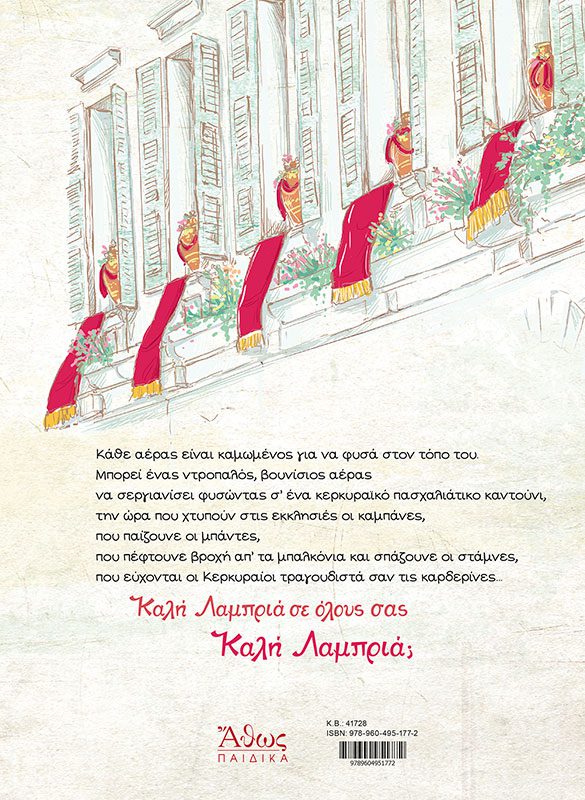 Κάθε αέρας είναι καµωµένος για να φυσά στον τόπο του. Μπορεί ένας ντροπαλός, βουνίσιος αέρας να σεργιανίσει φυσώντας σ’ ένα κερκυραϊκό πασχαλιάτικο καντούνι, την ώρα που χτυπούν στις εκκλησιές οι καµπάνες, που παίζουνε οι µπάντες, που πέφτουνε βροχή απ’ τα µπαλκόνια και σπάζουνε οι στάµνες, που εύχονται οι Κερκυραίοι τραγουδιστά σαν τις καρδερίνες… Καλή Λαμπριά σε όλους σας Καλή Λαμπριά;