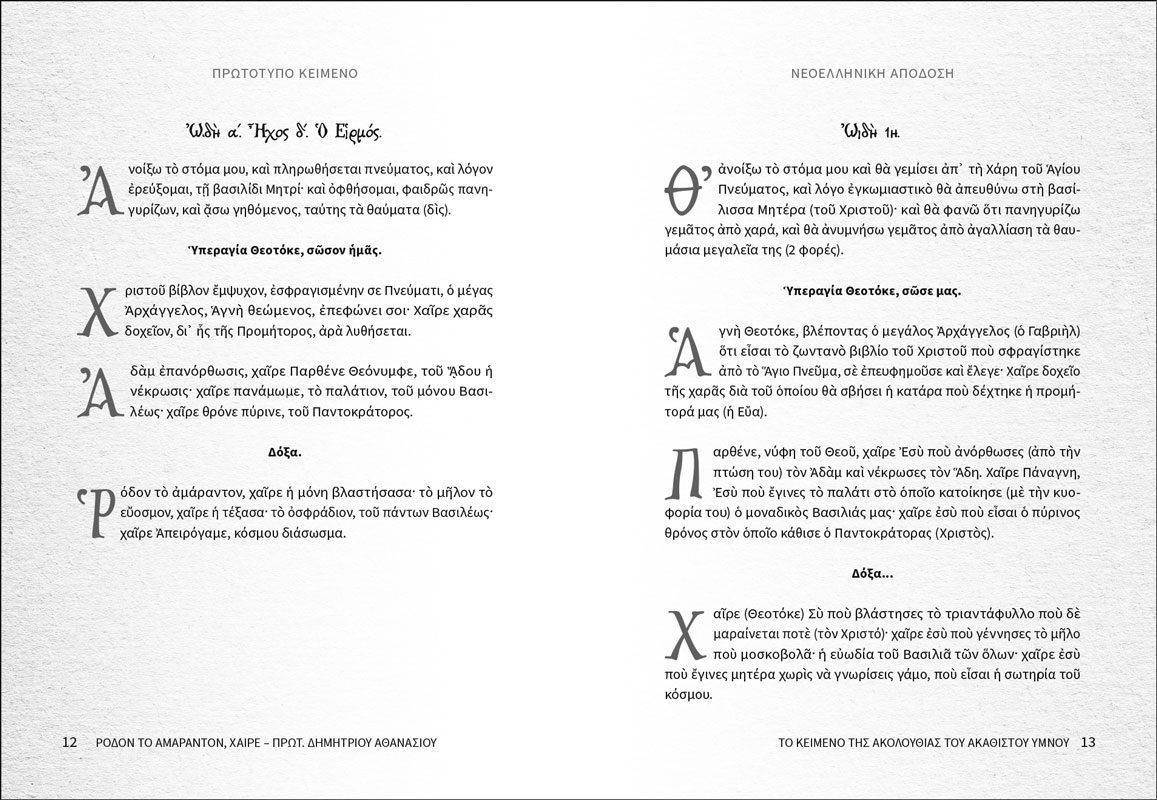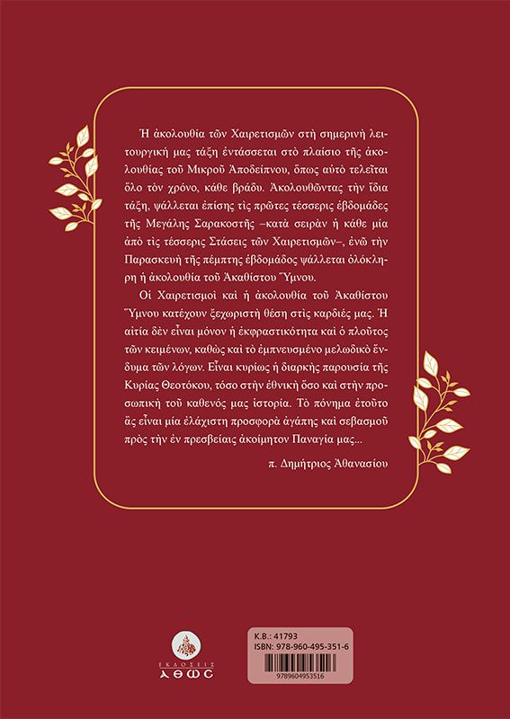 Η ακολουθία των Χαιρετισμών στη σημερινή λειτουργική μας τάξη εντάσσεται στο πλαίσιο της ακολουθίας του Μικρού Αποδείπνου, όπως αυτό τελείται όλο τον χρόνο, κάθε βράδυ. Ακολουθώντας την ίδια τάξη, ψάλλεται επίσης τις πρώτες τέσσερις εβδομάδες της Μεγάλης Σαρακοστής –κατά σειράν η κάθε μία από τις τέσσερις Στάσεις των Χαιρετισμών–, ενώ την Παρασκευή της πέμπτης εβδομάδος ψάλλεται ολόκληρη η ακολουθία του Ακαθίστου Ύμνου. Oι Χαιρετισμοί και η ακολουθία του Ακαθίστου Ύμνου κατέχουν ξεχωριστή θέση στις καρδιές μας. Η αιτία δεν είναι μόνον η εκφραστικότητα και ο πλούτος των κειμένων, καθώς και το εμπνευσμένο μελωδικό ένδυμα των λόγων. Είναι κυρίως η διαρκής παρουσία της Κυρίας Θεοτόκου, τόσο στην εθνική όσο και στην προσωπική του καθενός μας ιστορία. Το πόνημα ετούτο ας είναι μία ελάχιστη προσφορά αγάπης και σεβασμού προς την εν πρεσβείαις ακοίμητον Παναγία μας… π. Δημήτριος Αθανασίου