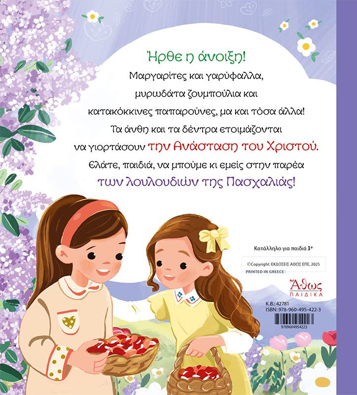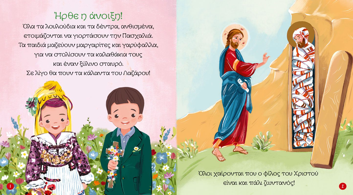 Ένα πρωτότυπο βιβλίο που συνδυάζει την ομορφιά της ανθισμένης ανοιξιάτικης φύσης με ΤΑ γεγονόΤΑ της Μεγάλης Εβδομάδας και της ΑνάσΤΑσης του Χριστού. Με κείμενα που είναι απλά και καΤΑνοητά για ΤΑ μικρότερα παιδιά, ξετυλίγονΤΑι ΤΑ γεγονόΤΑ της Μεγάλης Εβδομάδας και της ΑνάσΤΑσης, ενώ ΤΑυτόχρονα αναφέρονΤΑι και κάποια από ΤΑ έθιμα των ημερών αυτών. Οι πανέμορφες εικόνες της Αγγελικής Δελεχά ζωνΤΑνεύουν ΤΑ κείμενα με μοναδικό τρόπο! Ένα βιβλίο που είναι σχεδιασμένο ειδικά για ΤΑ παιδιά προσχολικής ηλικίας. Οι κόκκινες παπαρούνες και οι ΤΑπεινές μαργαρίτες, ΤΑ μυρωδάΤΑ ζουμπούλια και οι πασχαλιές στολίζουν τη φύση, αλλά και τις εκκλησίες μας. Και όλα μοιάζουν να φωνάζουν με χαρά «Χριστός ανέστη!».
